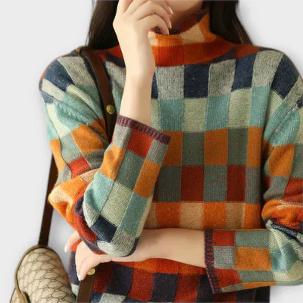 Svetr Rita s vysokým výstřihem je perfektní volbou pro ty, kteří hledají pohodlí a styl. Tento elegantní svetr vyniká svým zářivým kostkovaným vzorem , který vašemu vzhledu dodá moderní nádech.